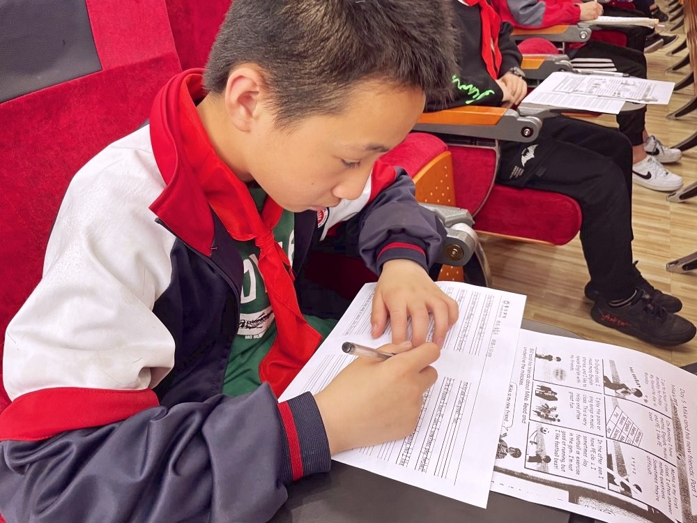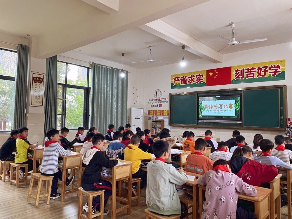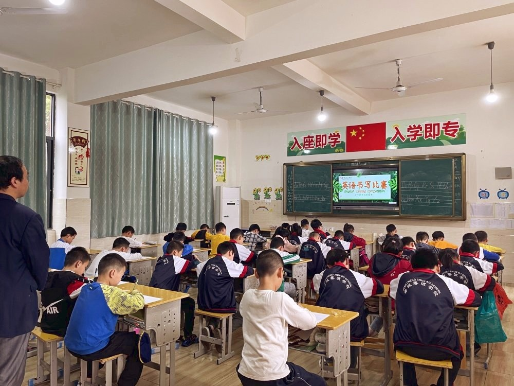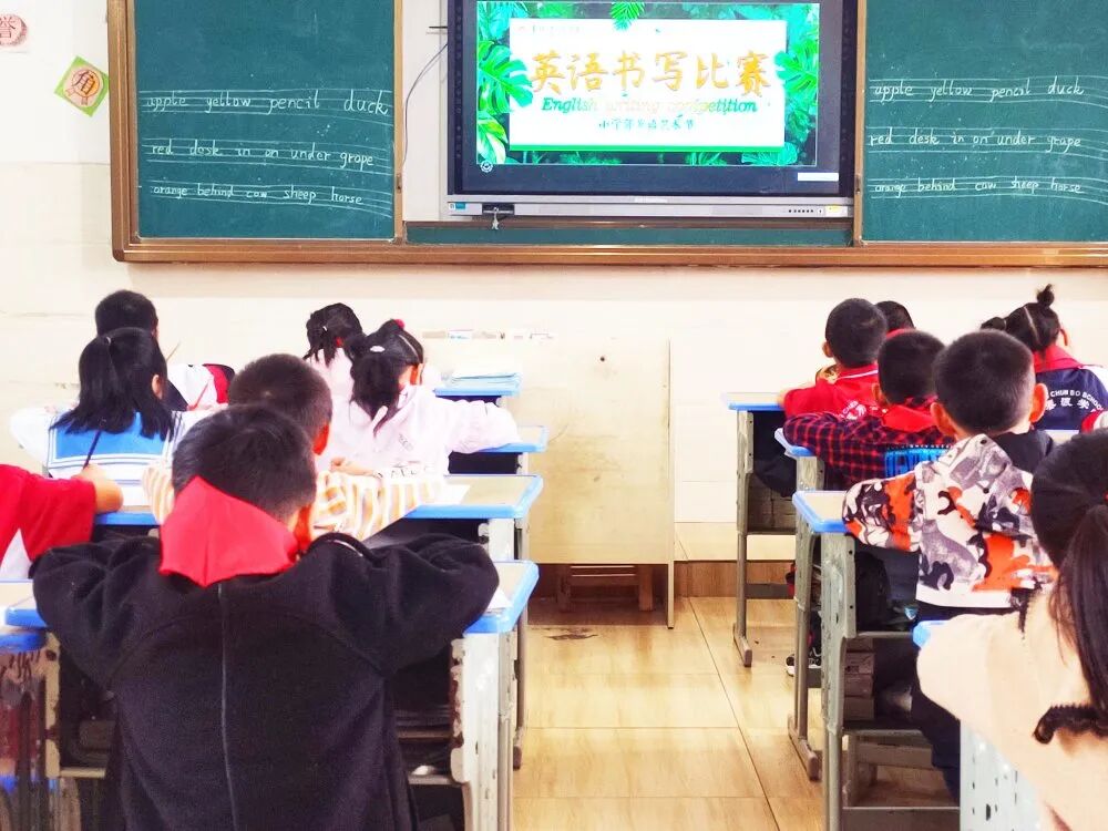 该年级段书写比赛由英语老师根据本班所学提供内容,要求学生统一纸张进行正确书写,限时20分钟,并要求做到正确率高,书面整洁、美观,笔势与运力规范、流畅。
