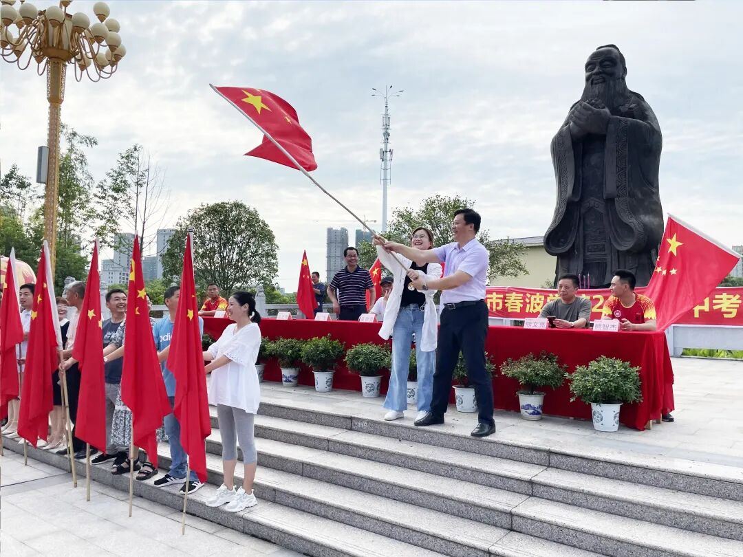 学生代表们接过旗帜,用力挥舞,猎猎战旗,迎风飘扬。舞动的红色传递着信心,凝聚着力量,飞扬着希望!