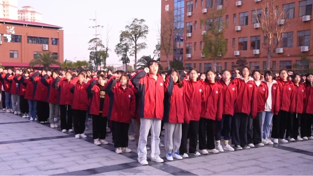 上午7:30分,广场上,同学们身着红色校服,以年级为单位摆出整齐的方阵,庄严肃立在国旗下,举行主题为《自强不息,成就自我》升旗仪式。