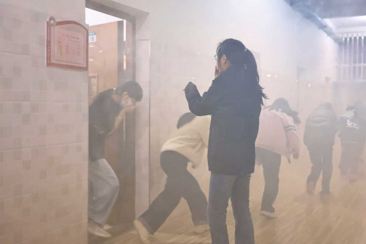 在模拟烟雾环境中,参练学生沉着冷静,严格遵循"掩住口鼻、低姿前行、不推不挤、依序快走"的疏散要求,沿既定的安全通道迅速向楼外集结区域转移。全体参与学生在预定时间内安全撤离至户外指定地点后,保持安全蹲姿,迅速完成人员清点。