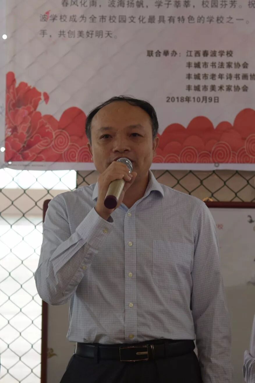 10月9日上午,丰城市首次规模最大、品味最高的诗书画作品展走进校园在江西春波学校隆重开幕,市委常委、宣传部部长陈晓建、市教育局局长刘拥军、市文联主席聂小梅等领导出席并讲话,江西春波学校校长袁春波作了热情洋溢的致辞。