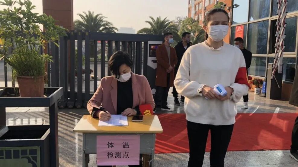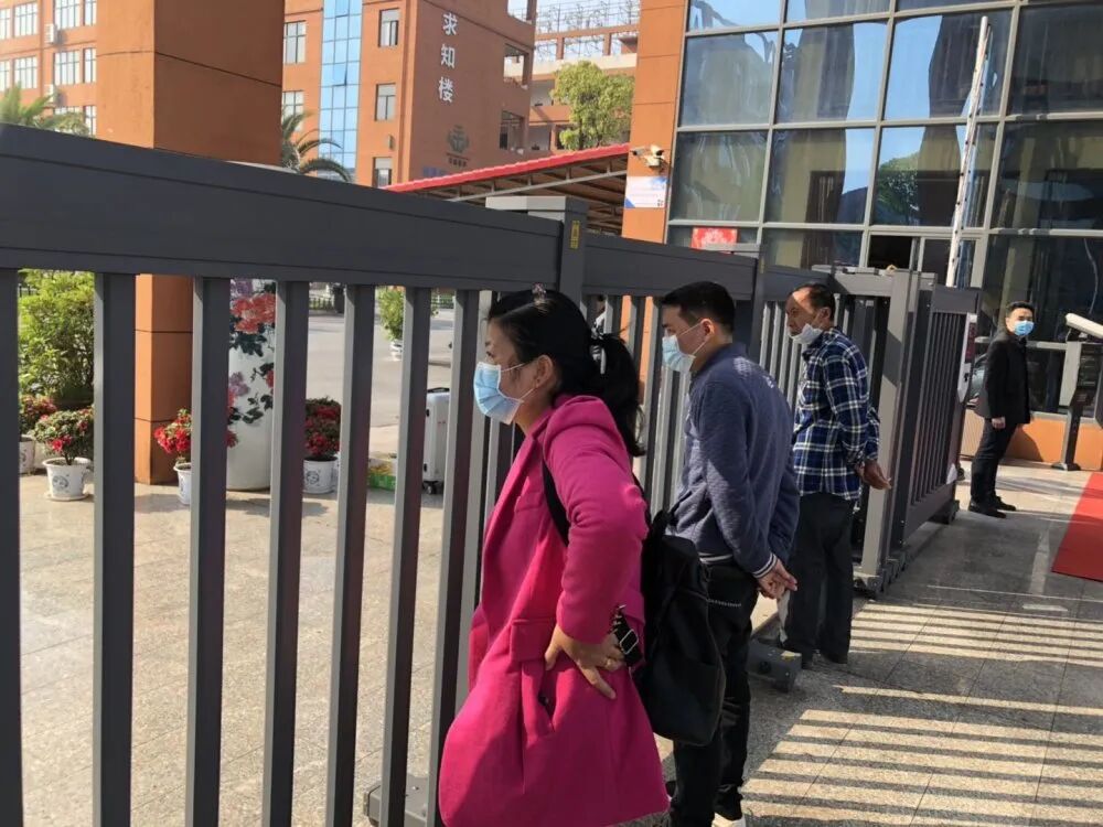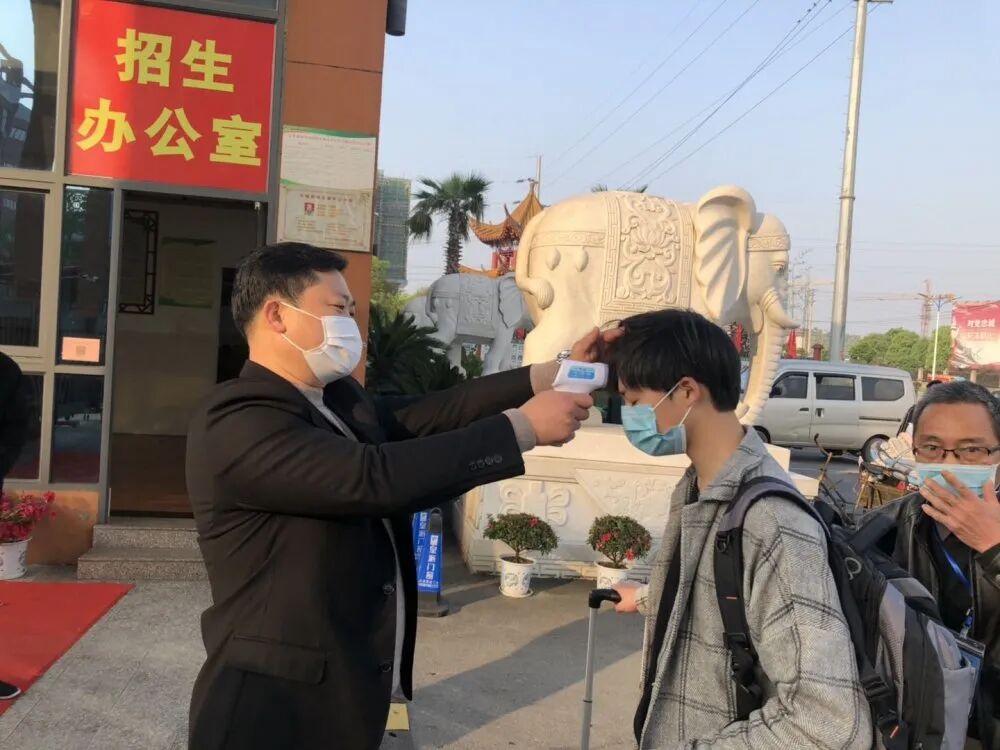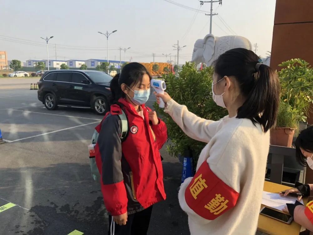 4月7日早上,初三各班学生按照指定通道,依次进入学校。学校领导、防疫工作人员、班主任和教练全部在校门口迎接,安排学生错峰入学,值日教师测量体温,让符合入校条件的学生进入校园。