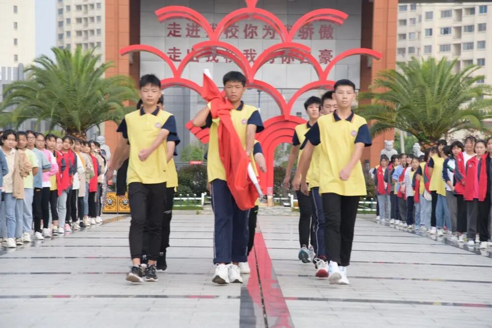 旗手们精神抖擞,迈着整齐的步伐从主席台经过。当雄壮的国歌奏起第一个悦耳的音符,鲜艳的五星红旗像一团炽热的火焰,沐浴在温柔的晨曦中徐徐上升。