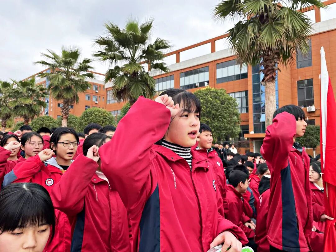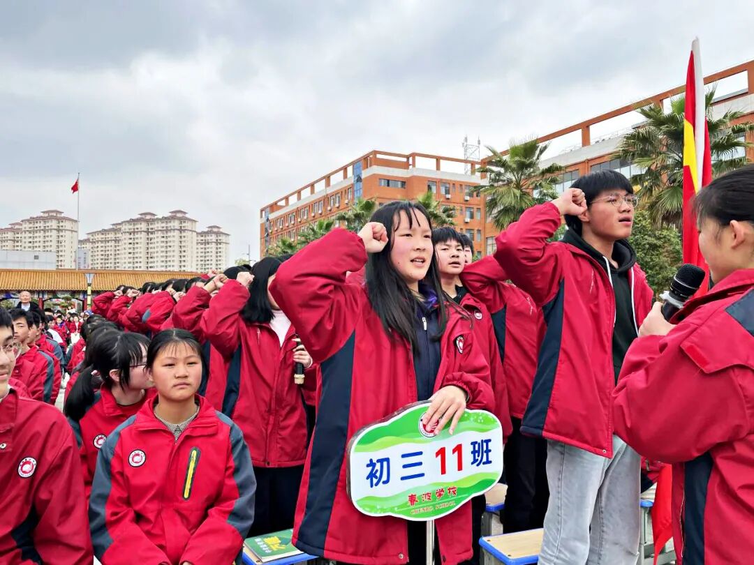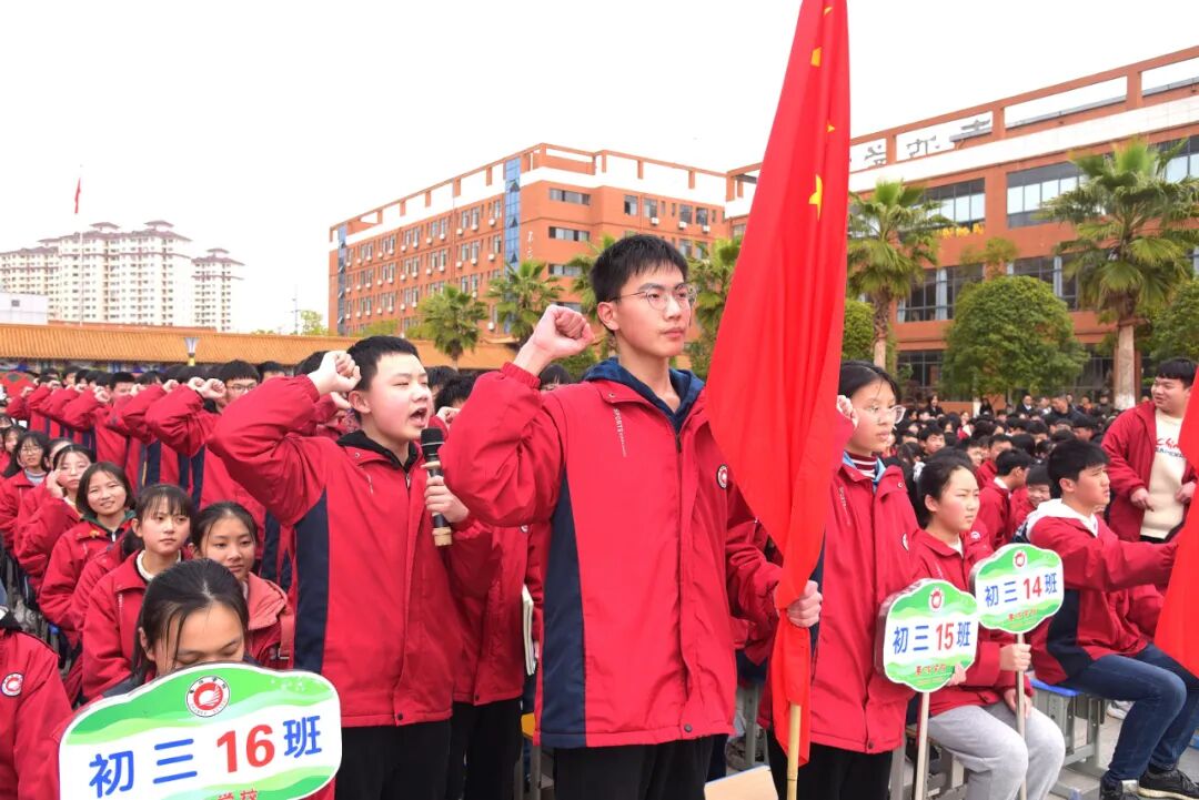 优秀学生代表——邓嘉文带领初三学子集体宣誓:“立大志,养大气,习大雅,成大器;惜时如金,勤学苦练,逆旅乾坤,待试锋芒;踏破山川,不惧路长,勠力同心,笑傲考场;执笔为芒,高考凯旋,博雅荣光;让青春无悔,让智慧闪光,我行,我能行,我一定行……”