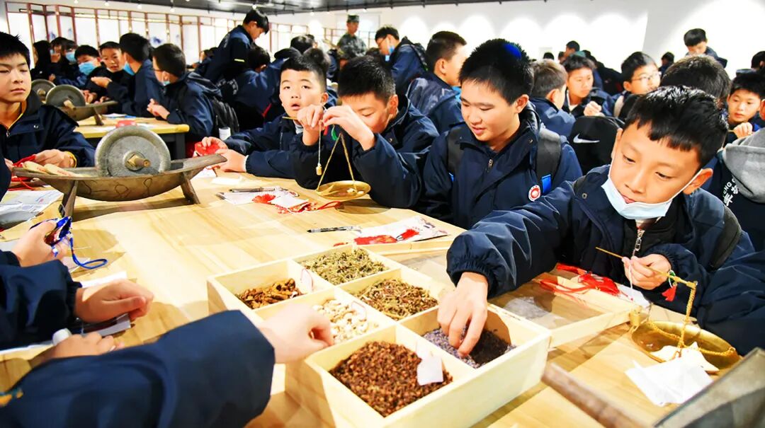 这是一堂生动有趣的体验课程,同学们通过研学老师的讲解认识了六味药材的外形、作用、以及功效,学会使用戥子称称药,学会配药、碾药并制作成精美实用的香囊。手捧着亲手制作的防疫香囊,同学们感受到浓浓的中药魅力,更体会到劳动所得的可贵。