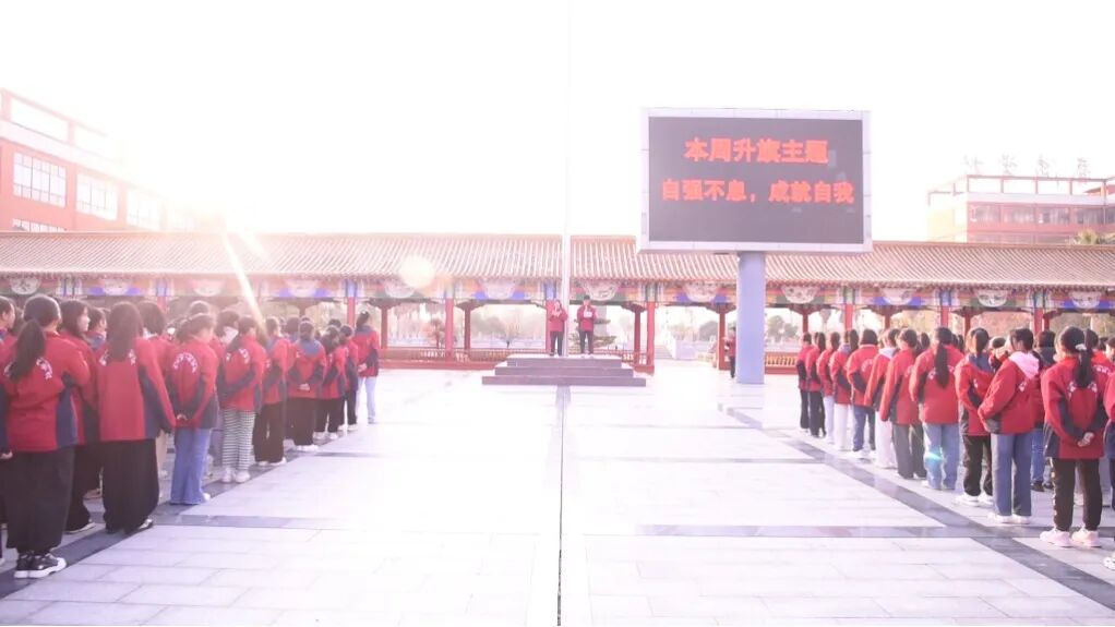 上午7:30分,广场上,同学们身着红色校服,以年级为单位摆出整齐的方阵,庄严肃立在国旗下,举行主题为《自强不息,成就自我》升旗仪式。