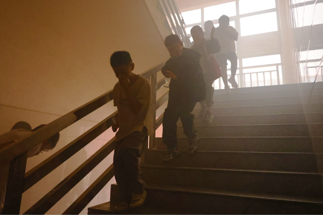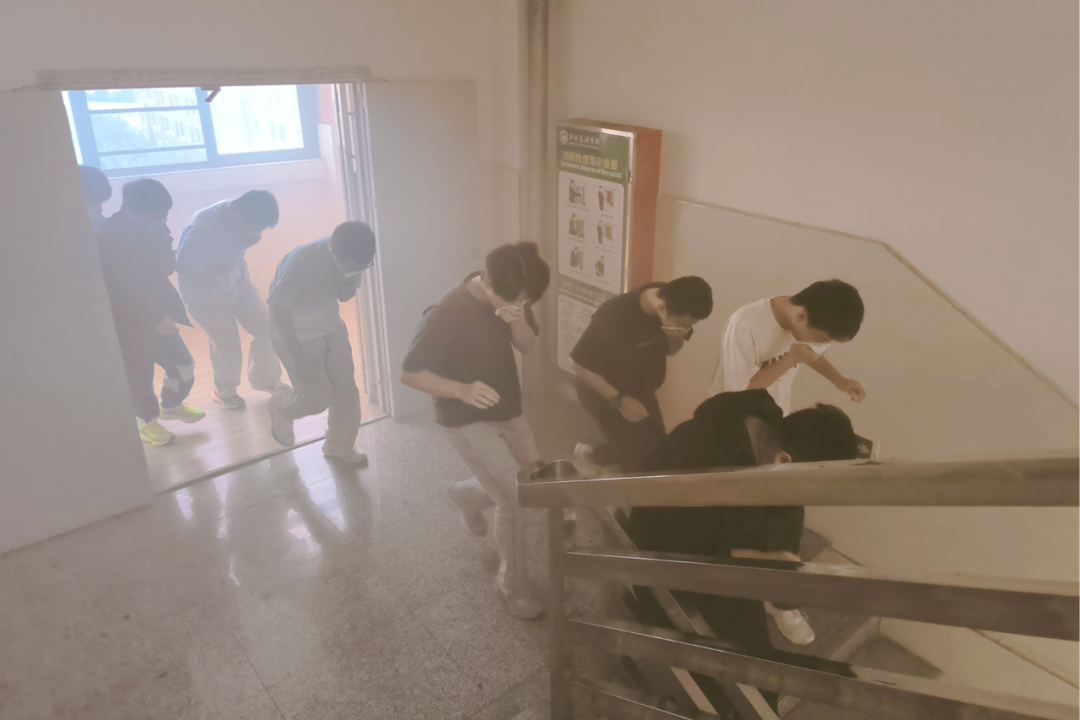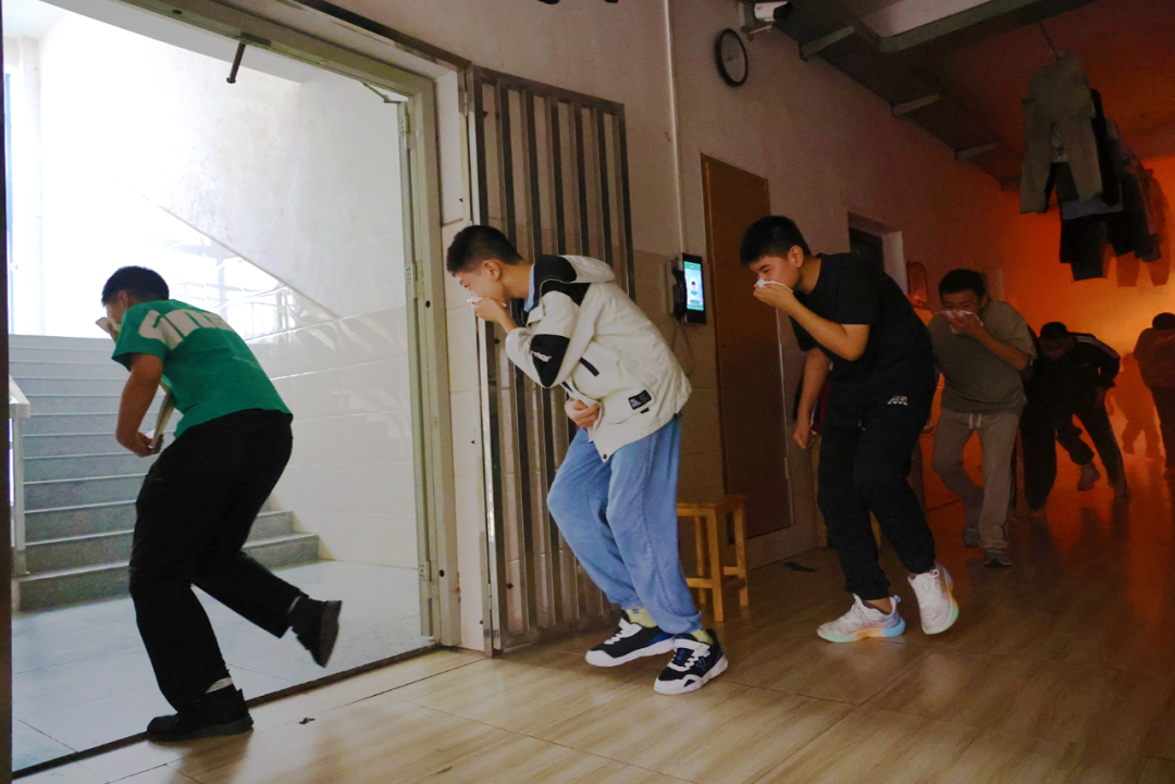 下午1时55分,尖锐急促的警报声骤然划破校园的宁静,消防逃生演练正式拉开帷幕。霎时间,各宿舍楼内的学生在各楼层教练员的清晰指引下,迅速做出反应。同学们严格按照班会所学,用提前准备好的湿毛巾紧紧捂住口鼻,弯腰低姿,沿着宿舍走廊和楼梯的右侧,形成一股股有序的人流,快速向楼下安全区域转移。