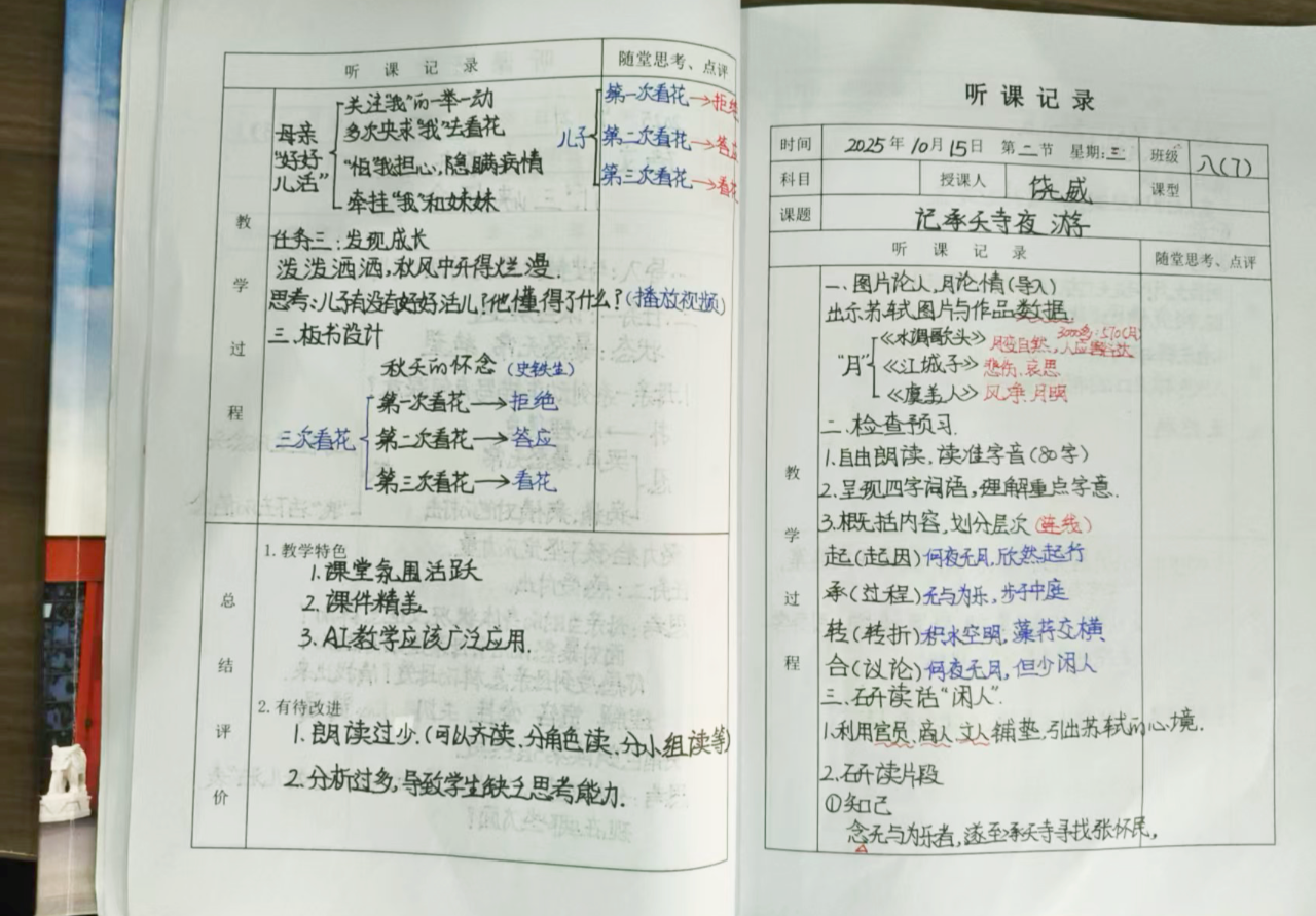 在检查过程中,检查组秉持“严标准、细流程、实导向”的原则,深入各个班级和教研场所,通过查阅资料、实地观察等方式,重点对教师课本批注、教案设计、听课本记录及学生作业批改等核心教学环节进行了认真核查。检查组成员仔细翻阅每一本教案,对照教学目标与重难点设计逐项审视;认真查看学生作业,逐本核对批改频次与批注细节;详实查阅听课记录,重点关注教学反思的针对性与深度。整个过程严谨细致,确保教学常规的每个环节都得到充分关注。