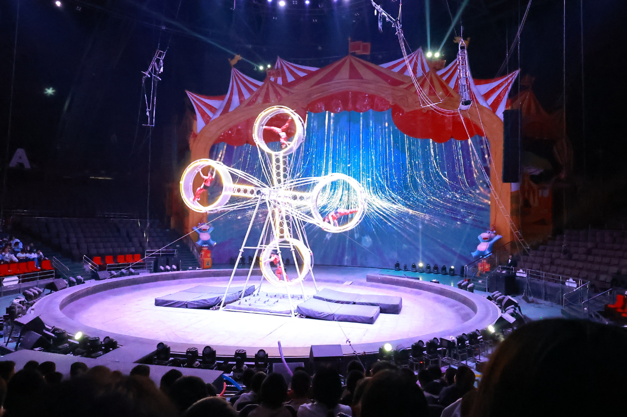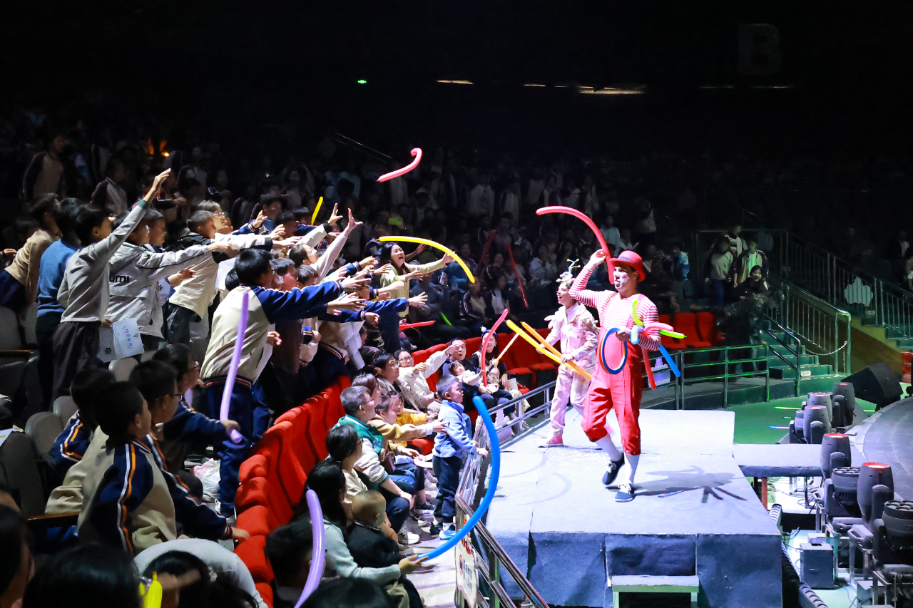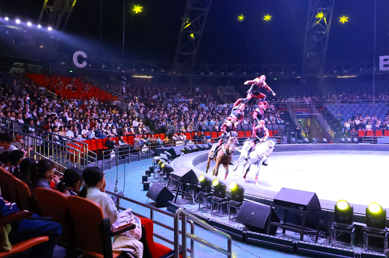 最令人期待的唯美国际大马戏,将整个研学活动推向高潮。魔轮表演中,特技演员在高速旋转的轮盘上完成行走、跳跃等高难度动作,展现极限挑战的勇气;魔幻时刻结合灯光与杂技,呈现唯美的视觉盛宴;非洲杂技融合文化元素与小丑互动,充满欢乐氛围;惊险马术表演中,演员在马背上完成空中特技,展现“奇、难、险、美”的完美结合;环球飞车环节,7辆摩托车在铁球内高速追逐,模拟极限竞速场景,引得全场惊叹连连。整场演出不仅是一场视听盛宴,更让同学们深刻感受到艺术背后的坚持与拼搏精神。