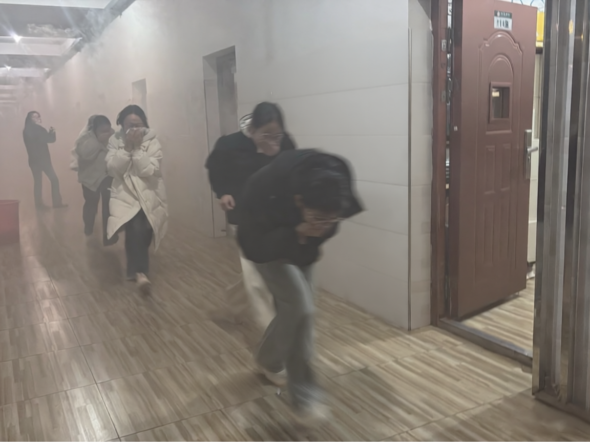 在模拟烟雾环境中,参练学生沉着冷静,严格遵循"掩住口鼻、低姿前行、不推不挤、依序快走"的疏散要求,沿既定的安全通道迅速向楼外集结区域转移。全体参与学生在预定时间内安全撤离至户外指定地点后,保持安全蹲姿,迅速完成人员清点。
